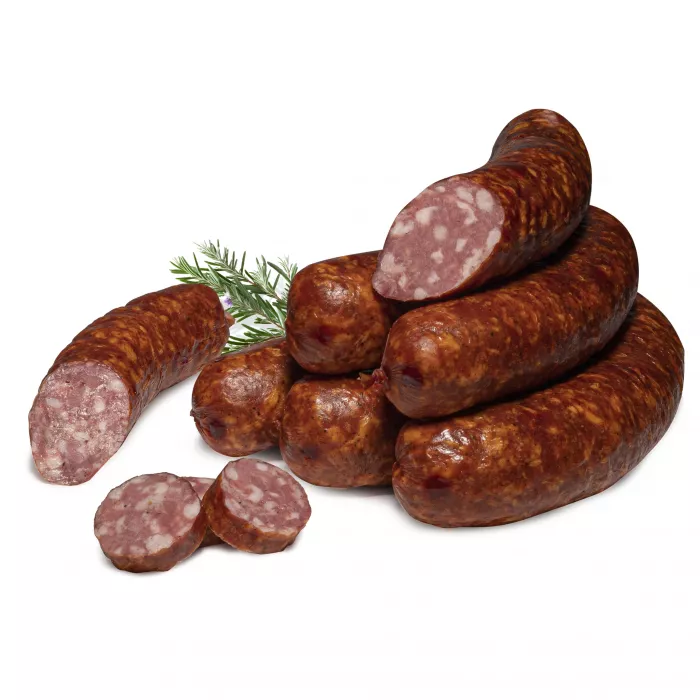 Zloženie: 83% bravčové mäso, 9% hovädzie mäso, bravčová slanina, pitná voda, cesnak, jedlá soľ, konzervačná látka E250, koreniny, bravčová bielkovina, dextróza, stabilizátory E 450, E 451; antioxidant E 300. Výživové hodnoty na 100 g výrobku: Energia: 1371 kJ/326 kcal; Tuky: 30,2 g; z toho nasýtené mastné kyseliny: 10,9 g; Sacharidy: 0,9 g; z toho cukry: 0,1 g; Bielkoviny: 13,0 g; Soľ: 1,5 g.Zloženie: 83% bravčové mäso, 9% hovädzie mäso, bravčová slanina, pitná voda, cesnak, jedlá soľ, konzervačná látka E250, koreniny, bravčová bielkovina, dextróza, stabilizátory E 450, E 451; antioxidant E 300. Výživové hodnoty na 100 g výrobku: Energia: 1371 kJ/326 kcal; Tuky: 30,2 g; z toho nasýtené mastné kyseliny: 10,9 g; Sacharidy: 0,9 g; z toho cukry: 0,1 g; Bielkoviny: 13,0 g; Soľ: 1,5 g.